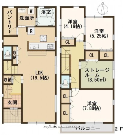 階数 区分 広さ 1F LDK 19.5帖 2F 洋 7.9帖 2F 洋 5.3帖 2F 洋 4.2帖 2F S 5.2帖 - 駐車場