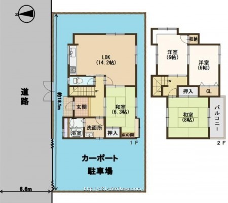 階数 区分 広さ 1F LDK 14.2帖 1F 和 6.3帖 2F 和 8.0帖 2F 洋 6.0帖 2F 洋 6.0帖 - 駐車場