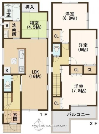 階数 区分 広さ 1F LDK 16.0帖 1F 和 4.5帖 2F 洋 7.8帖 2F 洋 6.8帖 2F 洋 6.0帖 - 駐車場