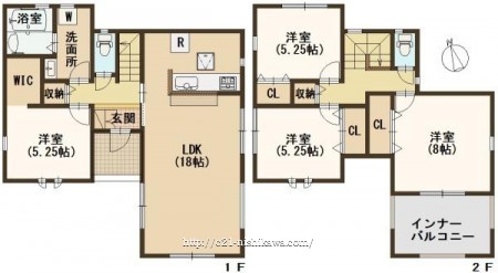 階数 区分 広さ 1F LDK 18.0帖 1F 洋 5.3帖 2F 洋 8.0帖 2F 洋 5.3帖 2F 洋 5.3帖 - 駐車場