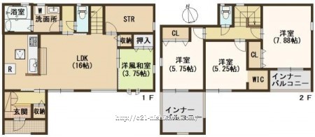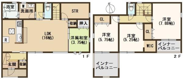 階数 区分 広さ 1F LDK 16.0帖 1F 和 3.8帖 1F S 3.5帖 2F 洋 7.9帖 2F 洋 5.8帖 2F 洋 5.3帖 - 駐車場