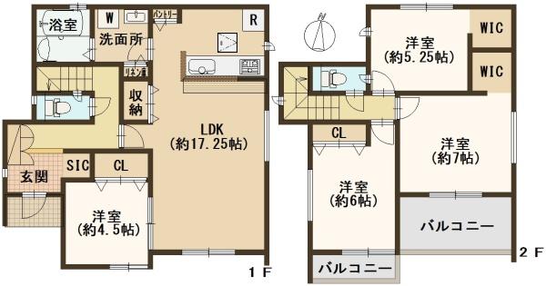 階数 区分 広さ 1F LDK 17.3帖 1F 洋 4.5帖 2F 洋 7.0帖 2F 洋 6.0帖 2F 洋 5.3帖 - 駐車場