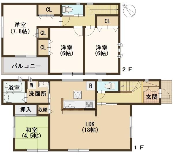 階数 区分 広さ 1F LDK 18.0帖 1F 和 4.5帖 2F 洋 7.8帖 2F 洋 6.0帖 2F 洋 6.0帖 - 駐車場