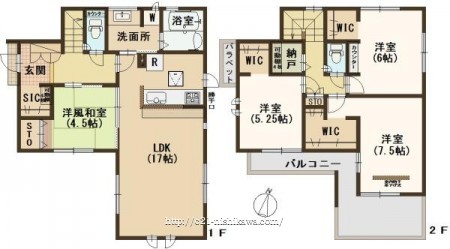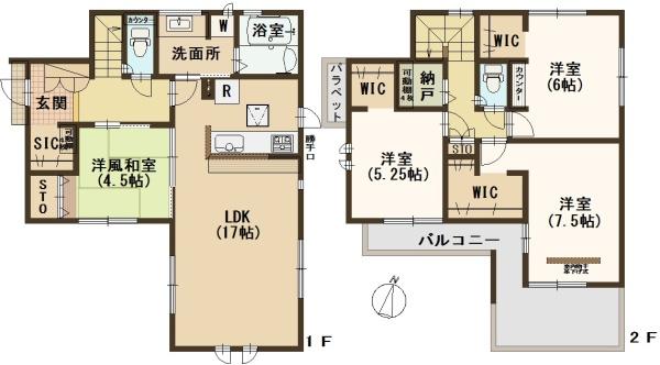階数 区分 広さ 1F LDK 17.0帖 1F 和 4.5帖 2F 洋 7.5帖 2F 洋 6.0帖 2F 洋 5.3帖 - 駐車場