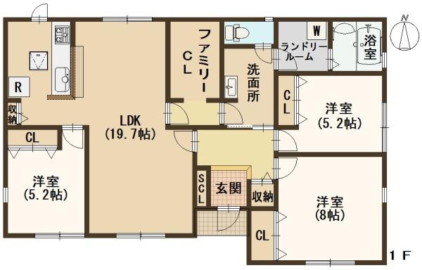 階数 区分 広さ 1F LDK 19.7帖 1F 洋 8.0帖 1F 洋 5.2帖 1F 洋 5.2帖 - 駐車場