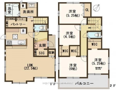 階数 区分 広さ 1F LDK 22.5帖 2F 洋 6.0帖 2F 洋 5.3帖 2F 洋 5.3帖 2F 洋 4.5帖 - 駐車場