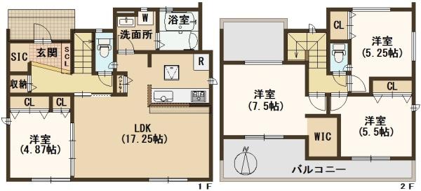 階数 区分 広さ 1F 洋 17.3帖 1F 洋 4.9帖 2F 洋 7.5帖 2F 洋 5.5帖 2F 洋 5.3帖 - 駐車場